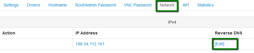 - 导航到“网络”选项卡。在这里,您可以看到分配给您的VPS的IP列表和“反向DNS”列。