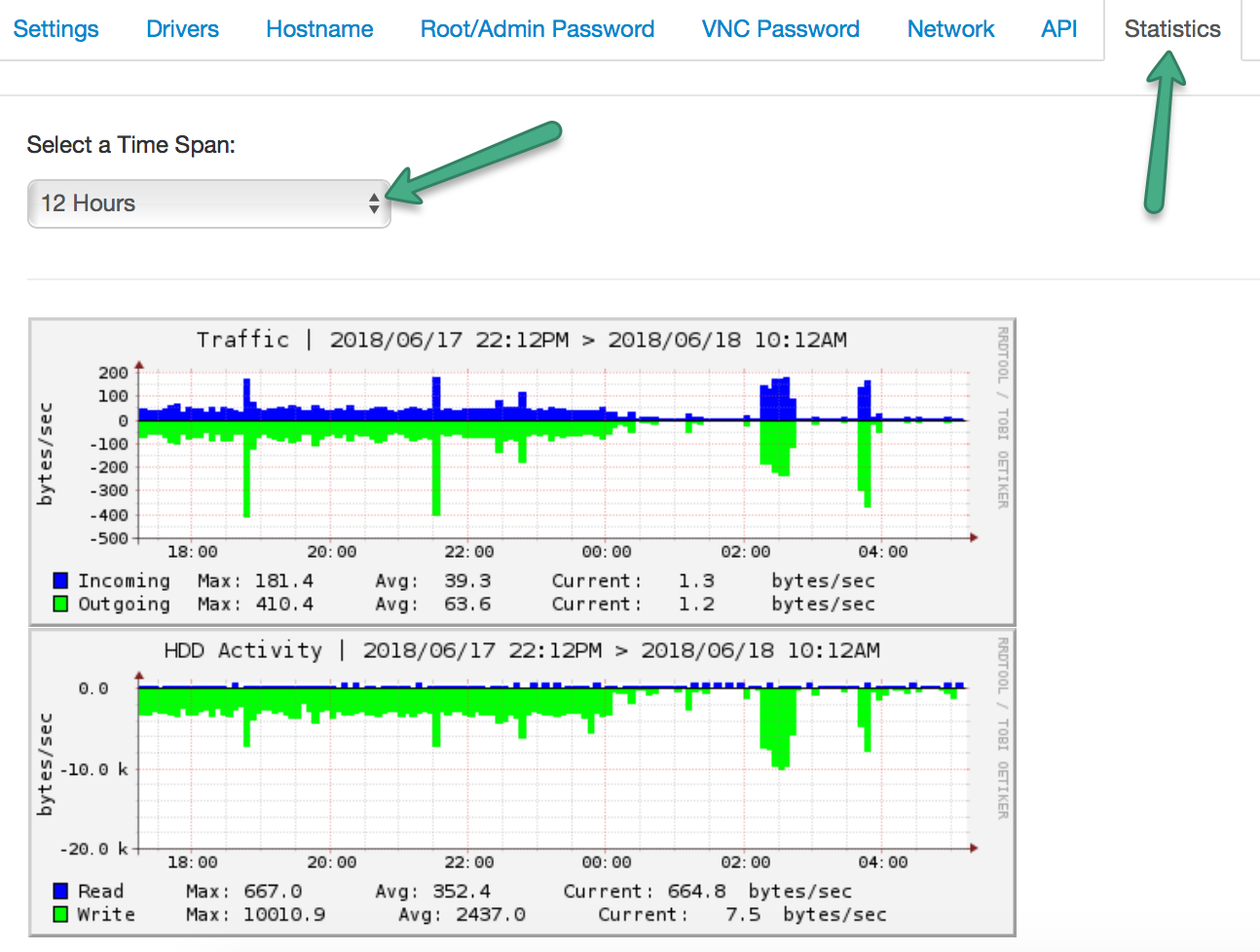 转到“统计信息”选项卡,然后从下拉列表中选择一个时间段,以查看“流量和磁盘空间使用情况”日志: