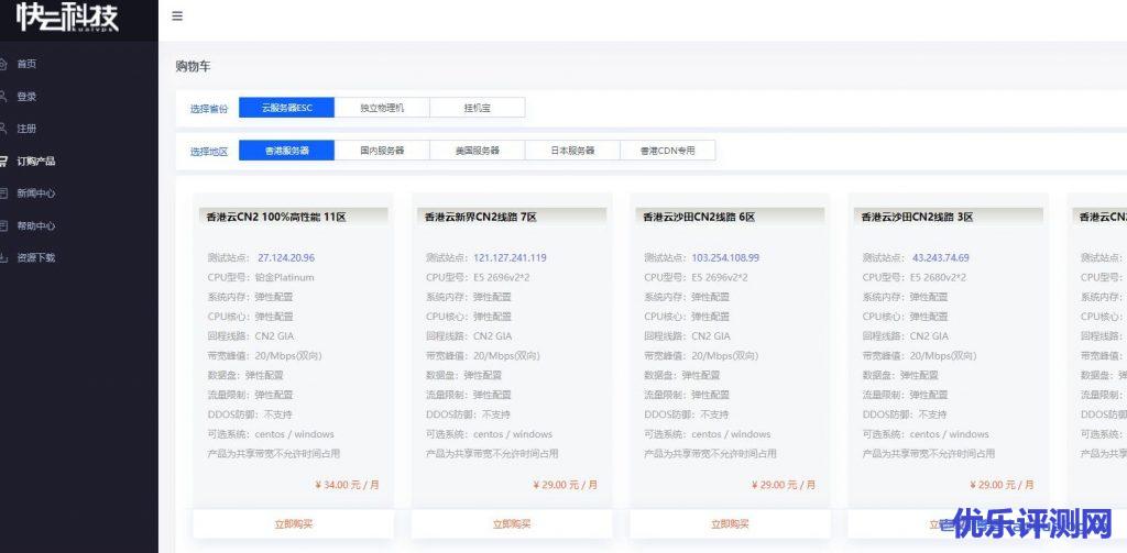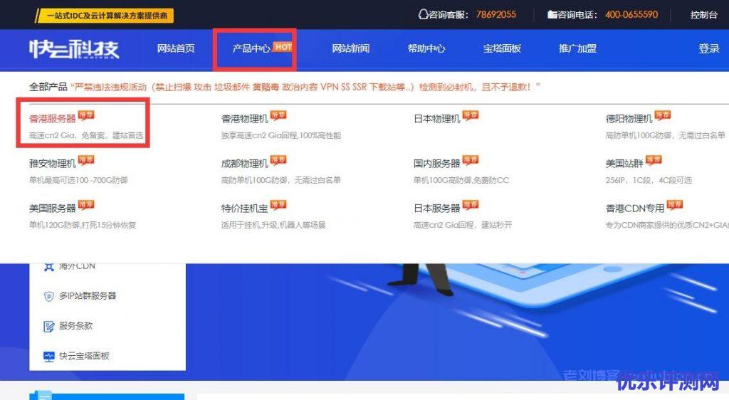 这里我们简单说下这款香港VPS具体购买入口选择。通过快云科技官网链接进入后,选择“产品中心”下的“香港服务器”,如下所示: