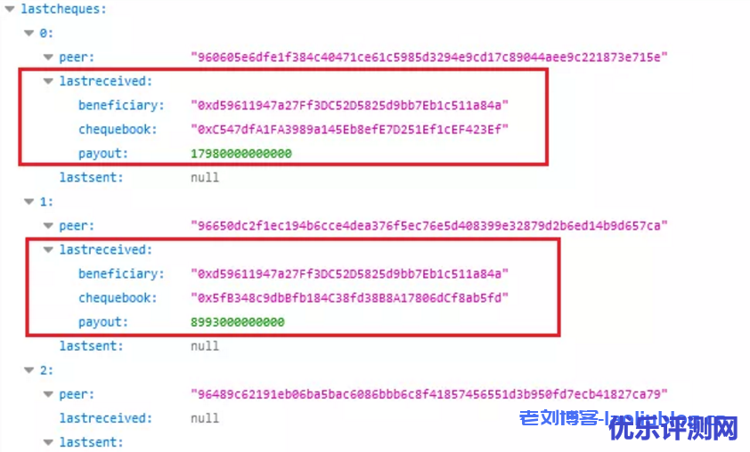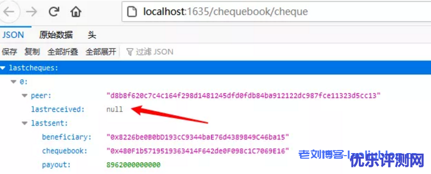 查询支票:http://localhost:1635/chequebook/cheque,如下图,lastreceived:null 表示还没收到支票。
