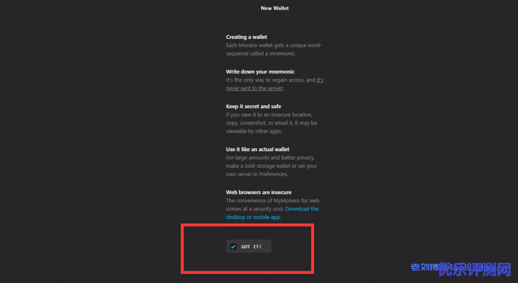 打开网页后,点击Create new wallet,进入下一步,进入以下页面,然后把下面的GOT IT那里勾一下,点击上面的Next。