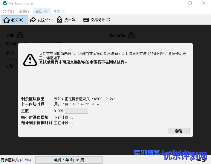 3,点击OK之后,就是一个比较漫长的安装等待过程了(真的很久,会长期停留在安装界面毫无动静,而且记得关闭杀毒软件,不然会各种拦截),安装完成后,就会开始漫长的区块同步,大概有5G。