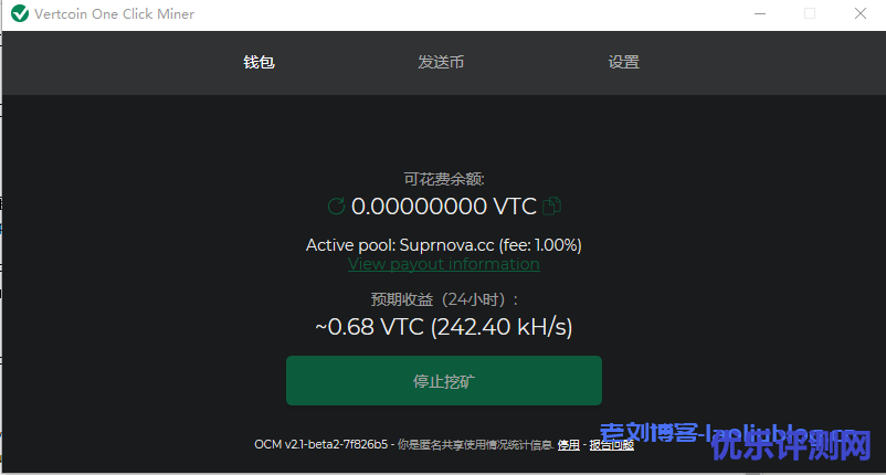 4,挖出来的币可以直接通过发送按钮发送到自己的钱包里面,也可以直接发送去支持VTC的交易所。