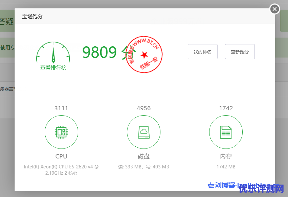 宝塔跑分测试结果:安装包装仅用时2分钟,跑分9809,性能还行!