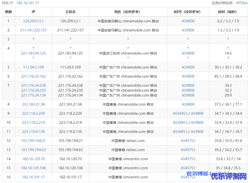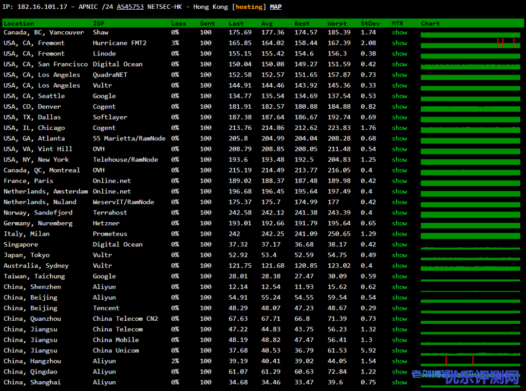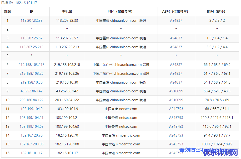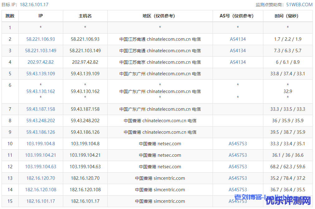 ---------------------------------------------------------------------- 广州电信 traceroute to 14.215.116.1 (14.215.116.1), 30 hops max, 32 byte packets 1 182-16-100-1.asia.cloud (182.16.100.1) 0.94 ms AS45753 中国, 香港, simcentric.com 2 * 3 182.16.120.73 0.86 ms AS45753 中国, 香港, simcentric.com 4 182.16.120.65 0.63 ms AS45753 中国, 香港, simcentric.com 5 103.199.104.70 1.18 ms AS45753 中国, 香港, netsec.com 6 183.91.50.213 1.92 ms AS4809 中国, 香港, chinatelecom.com.cn, 电信 7 59.43.248.193 4.32 ms * 中国, 香港, chinatelecom.com.cn, 电信 8 59.43.187.177 5.09 ms * 中国, 香港, chinatelecom.com.cn, 电信 9 * 10 59.43.130.121 8.37 ms * 中国, 广东, 广州, chinatelecom.com.cn, 电信 11 202.97.82.38 12.71 ms AS4134 中国, 广东, 广州, chinatelecom.com.cn, 电信 12 113.96.0.117 11.07 ms AS58466 中国, 广东, 广州, chinatelecom.com.cn, 电信 13 113.96.4.230 13.12 ms AS58466 中国, 广东, 广州, chinatelecom.com.cn, 电信 14 183.2.167.233 9.11 ms AS58466 中国, 广东, 广州, chinatelecom.com.cn, 电信 15 183.56.128.10 10.75 ms AS58466 中国, 广东, 广州, chinatelecom.com.cn, 电信 16 14.215.116.1 9.76 ms AS58466 中国, 广东, 广州, chinatelecom.com.cn, 电信 ---------------------------------------------------------------------- 上海电信 traceroute to 101.95.120.109 (101.95.120.109), 30 hops max, 32 byte packets 1 182-16-100-1.asia.cloud (182.16.100.1) 1.41 ms AS45753 中国, 香港, simcentric.com 2 * 3 182.16.120.73 0.61 ms AS45753 中国, 香港, simcentric.com 4 182.16.120.65 0.51 ms AS45753 中国, 香港, simcentric.com 5 103.199.104.74 2.69 ms AS45753 中国, 香港, netsec.com 6 103.199.104.45 0.96 ms AS45753 中国, 香港, netsec.com 7 203.12.205.241 1.63 ms AS4809 中国, 香港, chinatelecom.com.cn, 电信 8 59.43.249.9 2.18 ms * 中国, 香港, chinatelecom.com.cn, 电信 9 59.43.249.26 28.03 ms * 中国, 上海, chinatelecom.com.cn, 电信 10 59.43.187.69 28.65 ms * 中国, 上海, chinatelecom.com.cn, 电信 11 59.43.138.53 33.52 ms * 中国, 上海, chinatelecom.com.cn, 电信 12 101.95.120.109 29.22 ms AS4812 中国, 上海, chinatelecom.com.cn, 电信 ---------------------------------------------------------------------- 厦门电信 traceroute to 117.28.254.129 (117.28.254.129), 30 hops max, 32 byte packets 1 182-16-100-1.asia.cloud (182.16.100.1) 0.91 ms AS45753 中国, 香港, simcentric.com 2 * 3 182.16.120.73 0.39 ms AS45753 中国, 香港, simcentric.com 4 182.16.120.65 0.54 ms AS45753 中国, 香港, simcentric.com 5 103.199.104.74 0.94 ms AS45753 中国, 香港, netsec.com 6 103.199.104.45 0.89 ms AS45753 中国, 香港, netsec.com 7 unknown.telstraglobal.net (210.57.80.225) 1.16 ms AS4637 中国, 香港, telstra.com 8 i-97.hkth-core02.telstraglobal.net (202.84.156.53) 3.71 ms AS4637 中国, 香港, telstra.com 9 i-97.hkth-core02.telstraglobal.net (202.84.156.53) 31.67 ms AS4637 中国, 香港, telstra.com 10 i-15152.sgcn-core01.telstraglobal.net (202.84.141.109) 32.61 ms AS4637 新加坡, telstra.com 11 i-15152.sgcn-core01.telstraglobal.net (202.84.141.109) 32.71 ms AS4637 新加坡, telstra.com 12 i-91.istt04.telstraglobal.net (202.84.224.197) 32.21 ms AS4637 新加坡, telstra.com 13 unknown.telstraglobal.net (210.57.30.130) 32.74 ms AS4637 新加坡, telstra.com 14 59.43.189.201 42.97 ms * 中国, 广东, 广州, chinatelecom.com.cn, 电信 15 * 16 59.43.130.149 45.29 ms * 中国, 广东, 广州, chinatelecom.com.cn, 电信 17 59.43.140.34 57.97 ms * 中国, 福建, chinatelecom.com.cn, 电信 18 * 19 27.159.81.198 78.28 ms AS133775 中国, 福建, 厦门, chinatelecom.com.cn, 电信 20 117.25.141.106 74.71 ms AS133775 中国, 福建, 厦门, chinatelecom.com.cn, 电信 21 117.28.254.129 63.13 ms AS4809 中国, 福建, 厦门, chinatelecom.com.cn, 电信 ---------------------------------------------------------------------- 重庆联通 traceroute to 113.207.25.138 (113.207.25.138), 30 hops max, 32 byte packets 1 182-16-100-1.asia.cloud (182.16.100.1) 0.90 ms AS45753 中国, 香港, simcentric.com 2 * 3 182.16.120.73 0.61 ms AS45753 中国, 香港, simcentric.com 4 182.16.120.65 0.80 ms AS45753 中国, 香港, simcentric.com 5 103.199.104.70 1.91 ms AS45753 中国, 香港, netsec.com 6 121.189.2.49 1.63 ms AS4766 KT.COM 骨干网, kt.com 7 112.174.87.225 65.68 ms AS4766 KT.COM 骨干网, kt.com 8 112.190.31.189 68.27 ms AS4766 韩国, kt.com 9 112.190.31.186 68.97 ms AS4766 韩国, kt.com 10 219.158.43.245 67.72 ms AS4837 中国, 北京, chinaunicom.com, 联通 11 219.158.3.177 71.44 ms AS4837 中国, 北京, chinaunicom.com, 联通 12 219.158.5.153 127.31 ms AS4837 中国, 北京, chinaunicom.com, 联通 13 219.158.101.106 142.36 ms AS4837 中国, 重庆, chinaunicom.com, 联通 14 113.207.25.138 117.23 ms AS4837 中国, 重庆, chinaunicom.com, 联通 ---------------------------------------------------------------------- 成都联通 traceroute to 119.6.6.6 (119.6.6.6), 30 hops max, 32 byte packets 1 182-16-100-1.asia.cloud (182.16.100.1) 1.44 ms AS45753 中国, 香港, simcentric.com 2 * 3 182.16.120.73 0.37 ms AS45753 中国, 香港, simcentric.com 4 182.16.120.65 5.11 ms AS45753 中国, 香港, simcentric.com 5 103.199.104.70 2.01 ms AS45753 中国, 香港, netsec.com 6 43.252.84.209 2.65 ms AS10099 中国, 香港, chinaunicom.com, 联通 7 202.77.18.194 4.11 ms AS10099 中国, 香港, chinaunicom.com, 联通 8 43.252.86.129 9.25 ms AS10099 中国, 香港, chinaunicom.com, 联通 9 219.158.20.97 11.86 ms AS4837 中国, 北京, chinaunicom.com, 联通 10 219.158.24.133 8.92 ms AS4837 中国, 广东, 广州, chinaunicom.com, 联通 11 219.158.97.1 56.46 ms AS4837 中国, 广东, 广州, chinaunicom.com, 联通 12 219.158.97.74 86.03 ms AS4837 中国, 四川, 成都, chinaunicom.com, 联通 13 119.6.197.170 66.94 ms AS4837 中国, 四川, 成都, chinaunicom.com, 联通 14 119.7.220.226 67.00 ms AS4837 中国, 四川, 成都, chinaunicom.com, 联通 15 119.6.6.6 72.98 ms AS4837 中国, 四