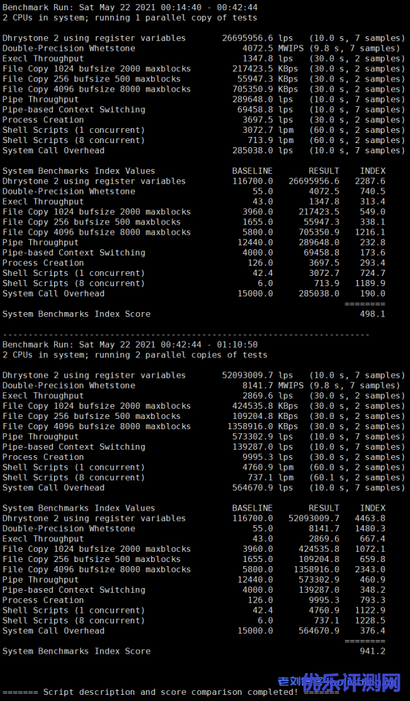 综合性能测试结果:单线程UnixBench跑分498,双线程跑分941.2。得分小于400的性能比较差、500-1000正常、大于1000优秀、大于2000极好。当然跑分不是认定机器好坏的唯一标准,需要综合考虑。这里跑分值属于正常级别。