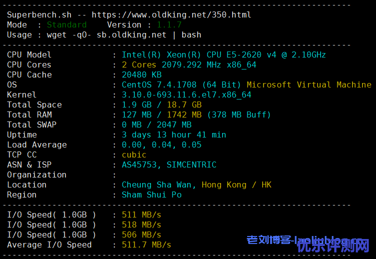 机器配置信息测试如下,与官方描述一致。同时IO性能达成511.7MB/s,还不错。