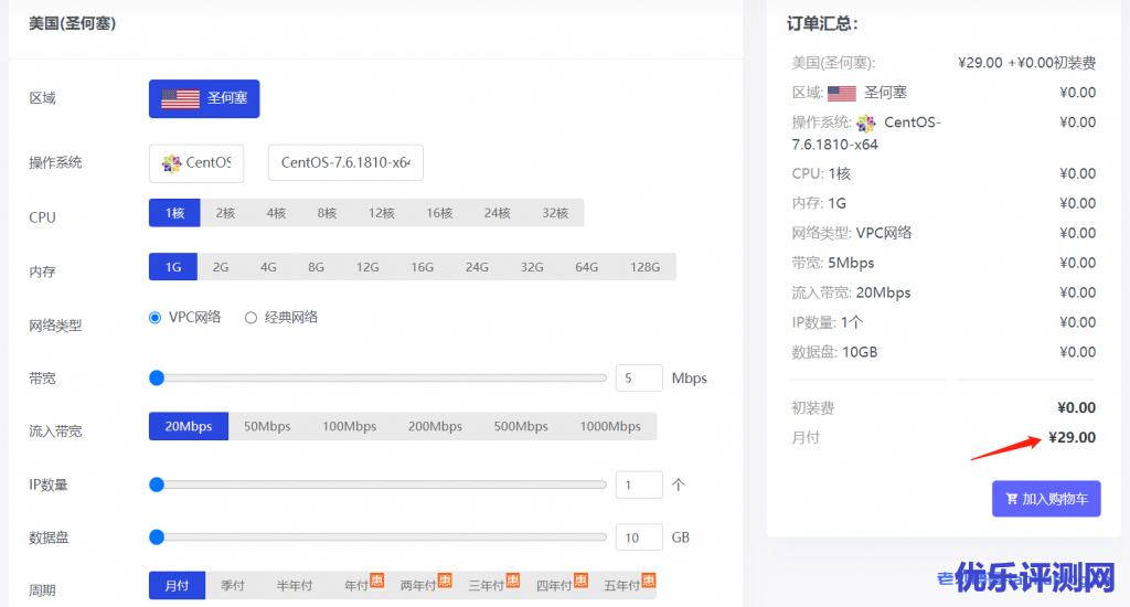 29元美国地区云服务器抵扣券可使用产品入口:官网首页导航栏【云服务器】→【美国地区(电信CN2)】→(进入)。图示如下:圣何塞1核1G内存5Mbps带宽(流入带宽20Mbps)10GB数据盘月付29元,使用抵扣券:apyp5YPy,刚好免费。当然也可以购买其他配置,补差价就行。