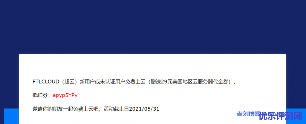 FTLCLOUD(超云)新用户或未认证用户免费上云(赠送29元美国地区云服务器代金券),抵扣券:apyp5YPy。邀请你的朋友一起免费上云吧,活动截止日2021/05/31。