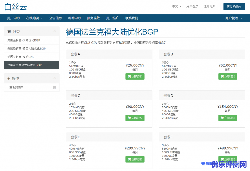 白丝云德国法兰克福大陆优化BGP VPS配置信息: