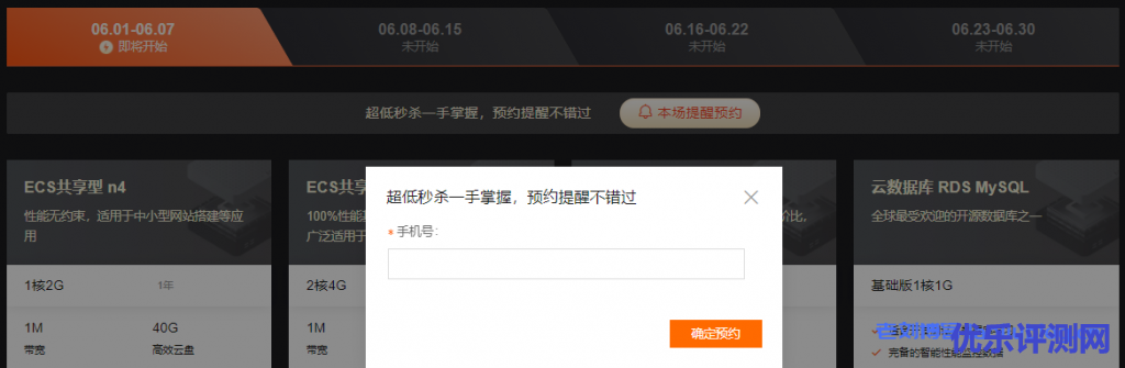 由于正式秒杀活动还没开始,我们可以在钜惠抢先看页面设定提醒通知,输入手机号,预约阿里云618活动秒杀提醒: