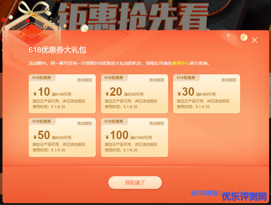 老刘博客领取的618优惠券大礼包,这些是新老用户同享的9折优惠券。由于老刘博客在阿里云平台是个人账号,不能参与领取618飞天会员专享大礼包,看放出来的内容应该也是9折券。