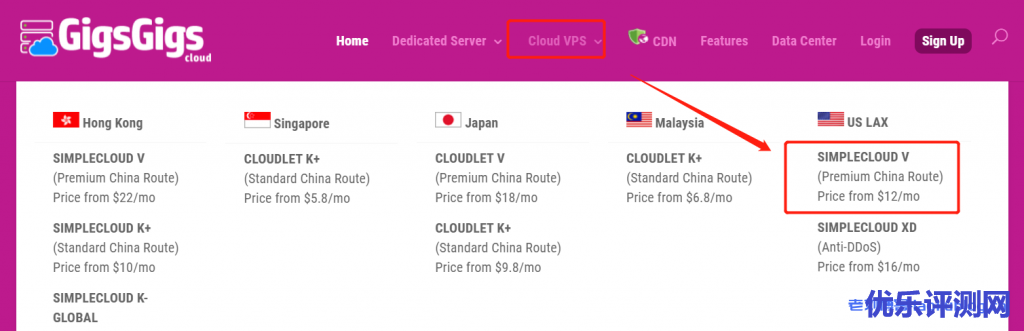 网站首页“https://www.gigsgigscloud.com/”,点击“Cloud VPS”下拉看到“SIMPLECLOUD V”进入,找到SimpleCloud V1进入购买即可。