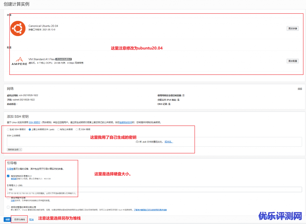 1)新建实例,创建的时候我们选择ubuntu20即可。注意,引导卷这里选择下硬盘大小,推荐100G,具体看图: