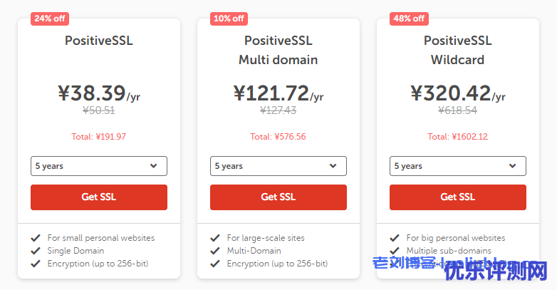 SSL证书优惠力度也是比较大的,比如PositiveSSL SSL证书5年191.97元,相当于38.39元/年。