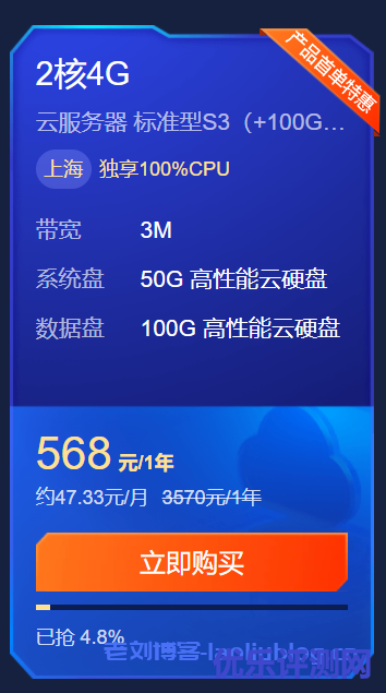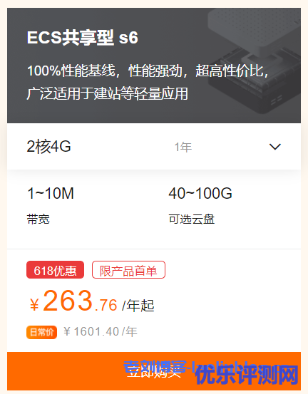 首先是阿里云,针对新用户,阿里云618上云年中促活动中,国内机房2核4G内存3M带宽40系统盘ECS共享型s6,注意是共享带宽,100% CPU性能,1年的价格是344.4元。前往购买>>