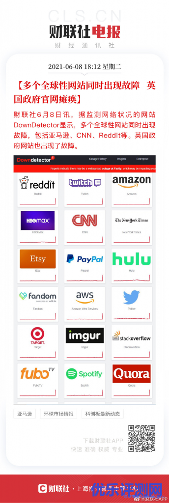 北京时间6月8日晚,据外媒报道,亚马逊、CNN、Paypal、《纽约时报》、英国政府在内的全球多家公司网站同时出现宕机。大部分网站页面出现“503 error”(服务器不可访问)报错提示,无法刷新。部分表现为图片加载显著延迟,或无法加载。