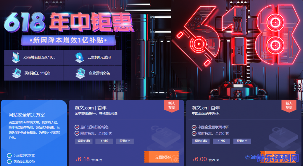 新网怎么样?新网是国内老牌知名域名注册商,与阿里云万网和腾讯云DNSPOD齐名。6月8日起,新网开启2021年618年中钜惠活动,其中.com域名特价低至首年6.18元,还有云主机、模板建站、客户管理系统0元试用,值得一看。温馨提示:如果要购买特惠域名,先领取域名优惠券之后再试用模板建站。