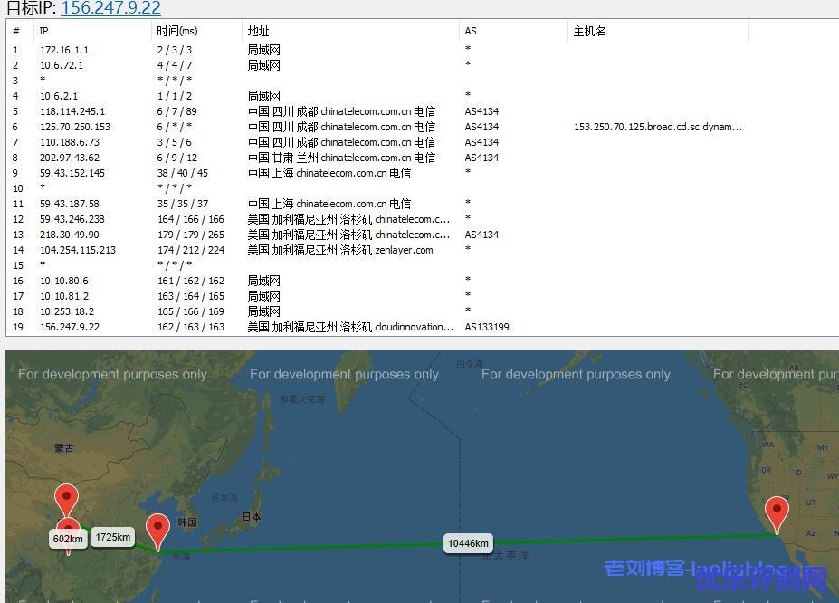 可以看到走的是59.43的CN2线路,然后从上海网口出去的,直达洛杉矶。