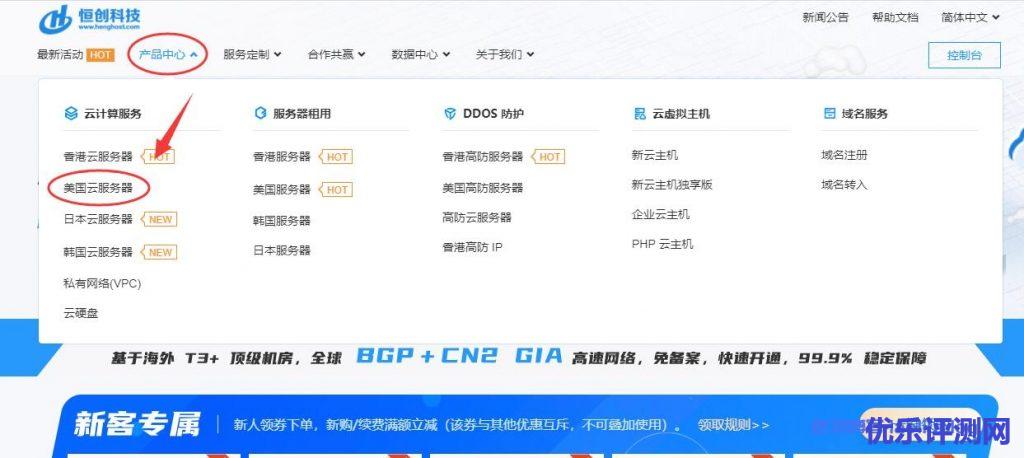 这里简单说下购买的问题,通过恒创主机官网链接进入后,选择“产品中心”菜单下的“美国云服务器”就是上面测试的美国VPS了,如下所示: