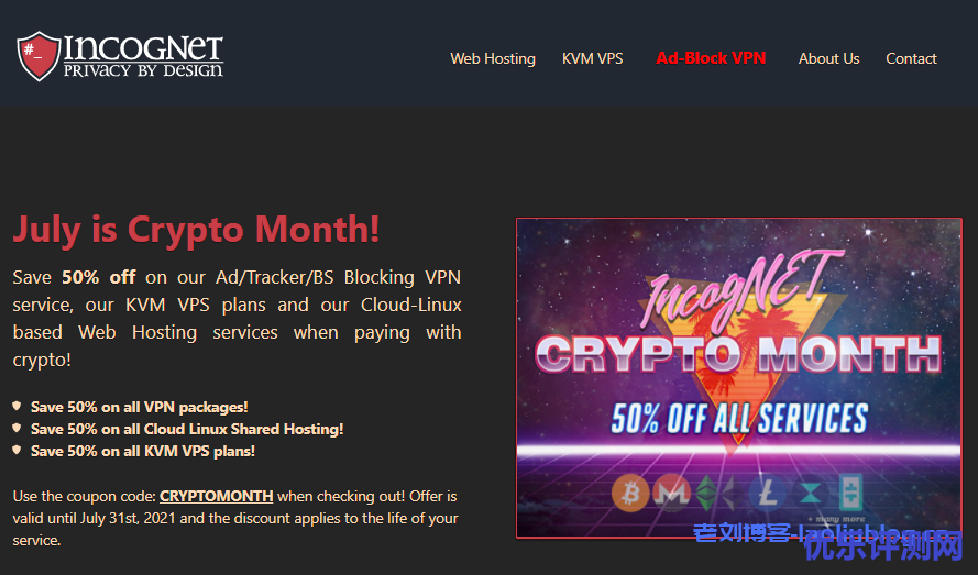 IncogNet 5折优惠码:CRYPTOMONTH,支持:BTC, BCH, DASH, DOGE, ETC, ETH, LTC, OXEN, THETA/TFUEL, & XMR