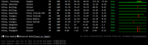 开启后在17ce.com网站内,老刘博客测试了测试机器的三网ping性能,国内延时均在72ms以内,上海本地延时达到了个位数字。