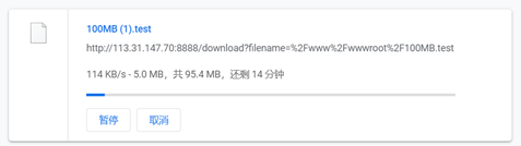 100MB测试文件,测试机器的下载速度为114KB/s。