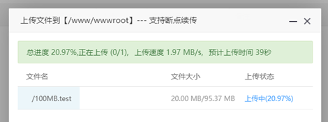 100MB测试文件,测试机器的上传速度为1.97MB/s;