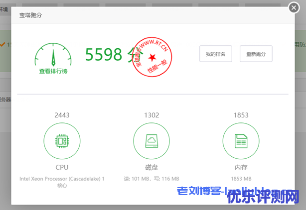 在测试机器上部署了宝塔跑分软件,1核2G 1M带宽 40G硬盘跑分5598,针对这一配置,这个分数很不错了!