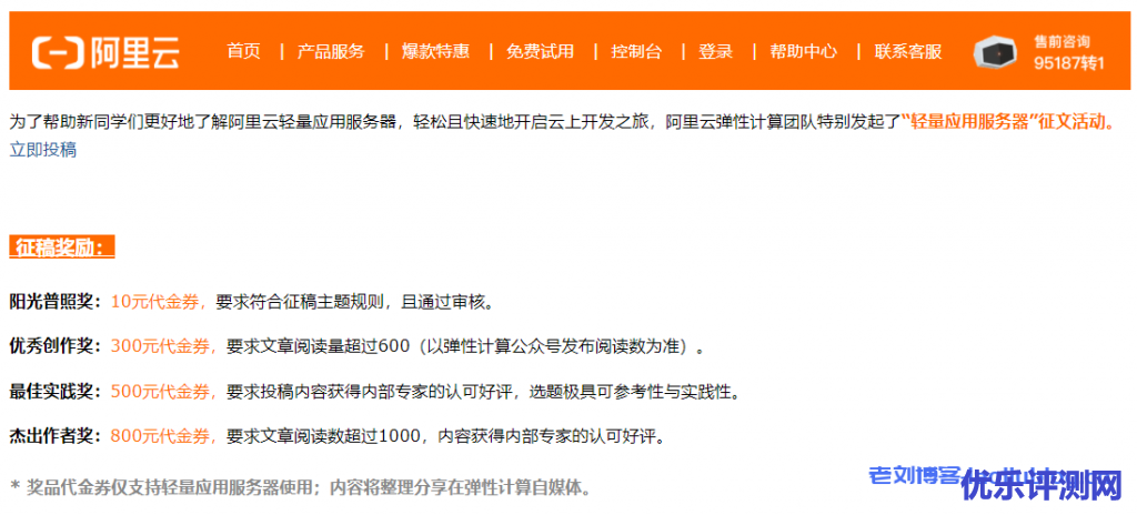 老刘博客今天收到阿里云推送邮件,商家推出针对旗下轻量应用服务器有奖征文活动,最高奖励800元代金券!有兴趣的网友们可以前往参加参加。
