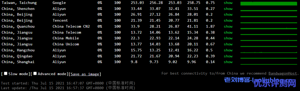 在ping.pe网站里,老刘博客测试了机器的丢包率情况,考虑到是国内大陆机器,研究海外丢包率没有什么意义,这里只截取了国内节点丢包率情况,不丢包,这与UCloud丢包3%形成对比。