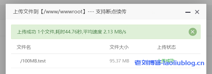 直接通过宝塔面板操作了测试机器上传下载老刘博客本地文件的上传下载速度(与UCloud机器测试结果差不多):