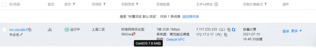 选购了腾讯云首单限时秒杀促销活动,价格首年99元的上海机房,老刘博客这里选择了标准型SN3ne云服务器,配置1核2G内存1M带宽,与UCloud提供的40G系统盘不同的是,腾讯云这里提供50G,多10G,价格贵5块钱。以下是下单后的机器列表: