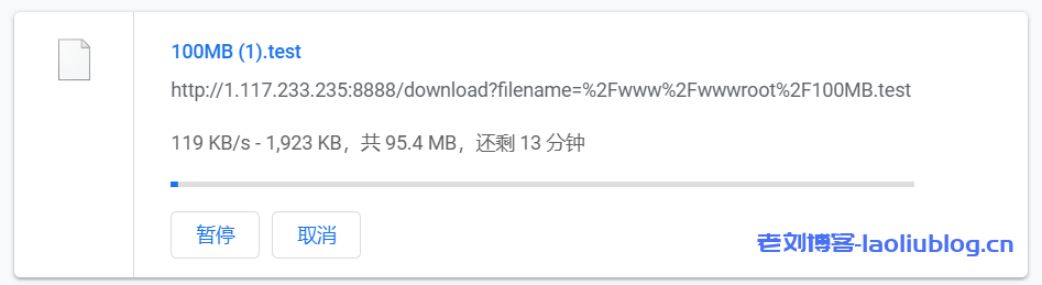 100MB测试文件,测试机器的下载速度为119KB/s。