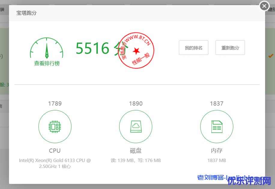 在测试机器上部署了宝塔跑分软件,1核2G 1M带宽 40G硬盘跑分5516(UCloud:5598),针对这一配置,这个分数很不错了!