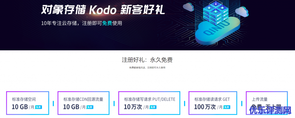七牛云注册新用户享受以下对象存储Kodo产品免费福利:标准存储空间10GB/月+标准存储CDN回源流量10GB/月+标准存储写请求PUT/DELETE 10万次/月+标准存储读请求GET 100万次/月+上传流量免费无上限!