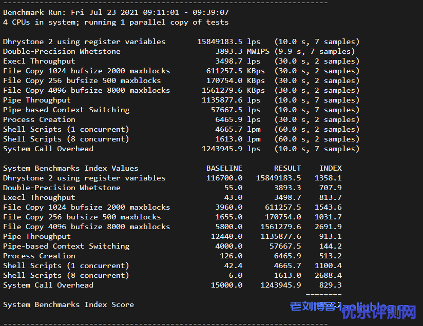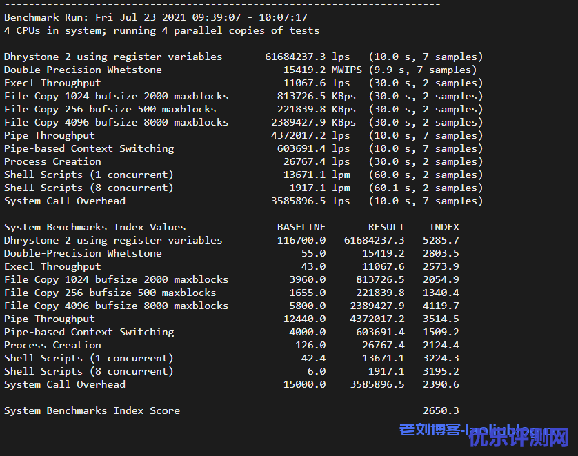 我们来个UnixBench机器综合性能跑分,单核952分,多核2650分: