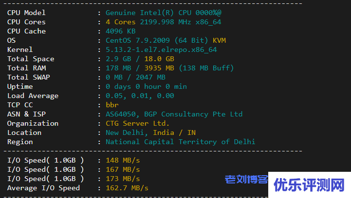 本次老刘博客测试用的快云科技机器是4核心,4G内存,10G系统盘+10G数据盘,全部是SSD,20Mbps共享带宽(双向),默认IP1个,最多可选5个,硬盘I/O平均在163MB/S,站长默认开启BBR,如下图: