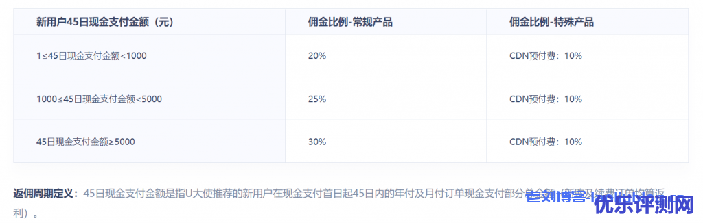 阿里云返利幅度看云气值,腾讯云的按积分,华为云的论有效客户连续推广月份,套路太多,其实绝大部分人还是基本性返利比例,UCloud优刻得CPS推荐返利规则简单,一目了然,而且返新客户现金支付首日起45日内的年付和月付订单金额(含新购和续费)。