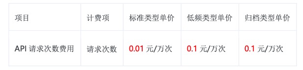 1.请求费用的计费项包括:Put类型请求次数、Get类型请求次数以及归档数据取回请求费用。
