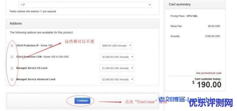 然后确认没有选择其他的附加项,然后点击“continue”,如下图所示: