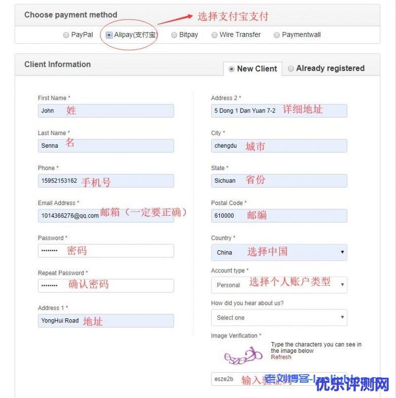 然后选择支付方式,国内购买最好选择“Alipay”支付宝支付方式, 然后输入姓名、地址、邮箱、手机等,邮箱一定要正确,其他可以不用真实的,如下图所示: