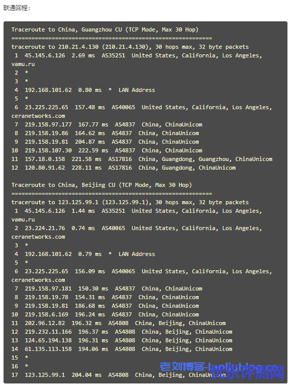 近期联通CUVIP的线路非常火热,六一云也推出了这类线路的套餐以及优惠,关于这个线路,老刘博客在多篇文章都有提到过,目前到国内优质线路排行大致如下:电信CN2 GIA>联通AS9929>联通AS4837>电信CN2 GT>普通线路,AS4837线路比起前两的优势就是带宽比较大,相对便宜一些,所以大家才能看到这个线路的带宽都非常高,今天老刘博客给大家测试一下六一云新上的AS4837套餐,大家可以参考一下,所有测试都是在晚高峰进行的,所以风格比较空闲的时候效果会更好。