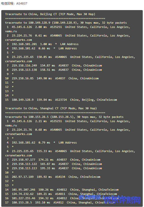 去程三网统一走普通线路,回程三网都是AS4837