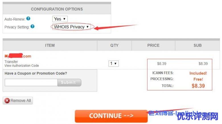 3.进入转移域名续费页面(一般转移域名都需要在迁移目的域名商这里续费一年),我们勾选免费赠送的隐私协议(默认没有的哦),然后点击续费,下单就可以了。