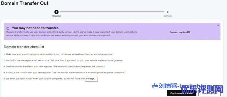 4.进入转移域名设置页面,同意协议,并且可以看到提示,通常迁移需要5-7天时间完成迁移。点击 “ Continue with transfer ”进入下一步,如图