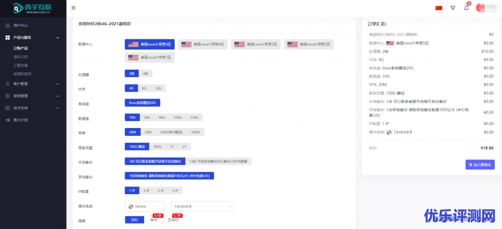 老刘博客前文《青宇互联湖北十堰机房8月促销活动,20M或30M大带宽不限流量云服务器,免费赠送100G防护,新用户6折优惠35元/月,老用户8折优惠,续费同价!》有介绍青宇互联2021暑假活动中推出的湖北十堰机房云服务器套餐,其实,活动中也有款免备案美国cera大带宽VPS【美国特价2核4G-2021暑假款】,值得入手,2核4G内存20Mbps带宽100G流量仅19.9元/月!
