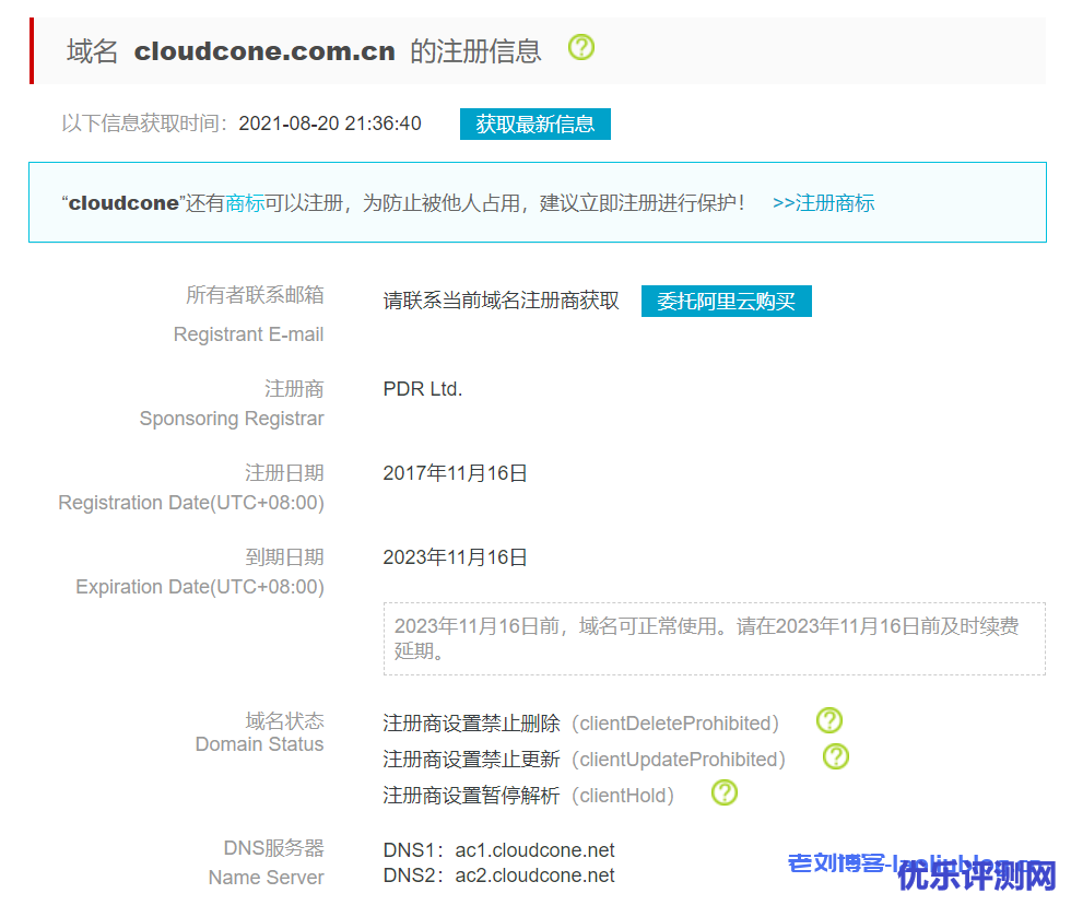 昨天有网友告诉老刘博客说CloudCone控制台app.cloudcone.com.cn域名不能访问了,上去看了下还真是这样。老刘博客查了下whois信息,看状态域名已被注册商设置暂停解析(clientHold)。