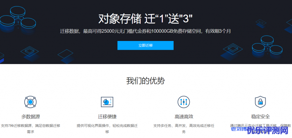 老刘博客留意到腾讯云官方置顶了5月1日就开始进行的对象存储COS迁1送3活动,看样子应该是对对象存储迁移服务进行了升级,最高可得25000元无门槛代金券和100000GB免费存储空间,有效期3个月!