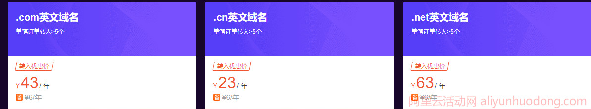 .com域名转入优惠价43元,.cn域名转入优惠价23元,.net域名转入优惠价63元(实时的转入价格以活动内显示为准)。